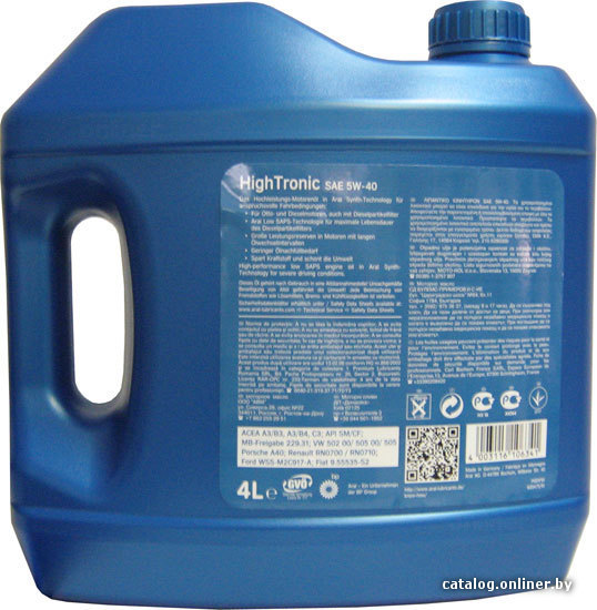 Высококачественное моторное масло Aral HIGH TRONIC SAE 5W 40, разработанное по технологии “ARAL-синтез”. Моторное масло 5W40 применяется в бензиновых и дизельных двигателях и сохраняет свои качества при увеличенных интервалах замены.